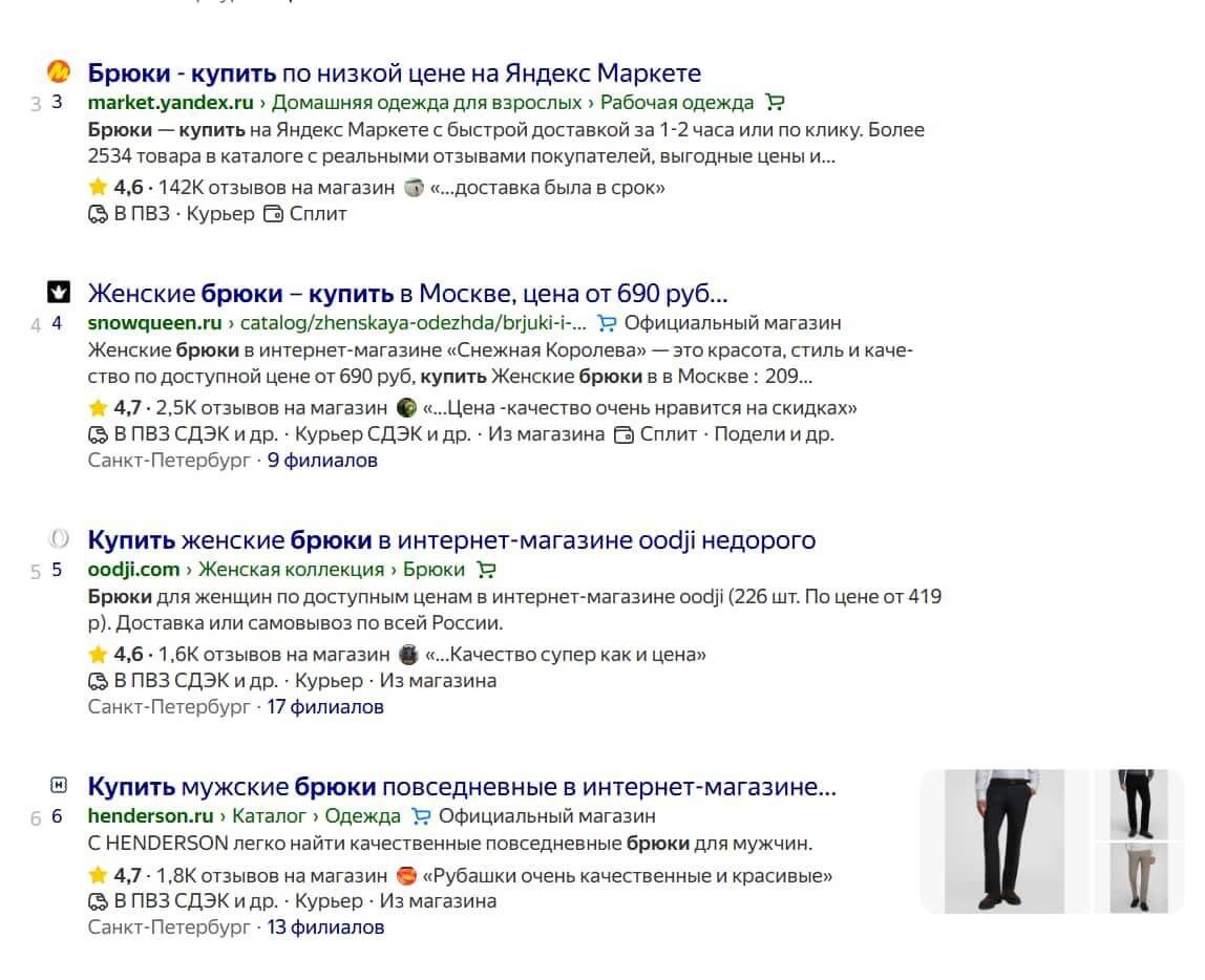 Главный плюс — расширенный сниппет в поиске. Когда сайт участвует в «Яндекс Товарах», его сниппеты в выдаче дополняются следующими элементами: