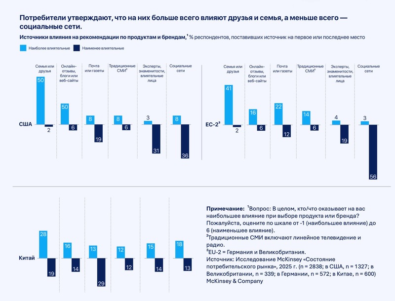 Каналы, впрочем, различаются. Если копнуть глубже, в каждом сегменте свой «микс влияния». Например, для категории путешествий заметную роль играют инфлюенсеры: 38% потребителей в США ставят блогеров в топ-3 источников, которым доверяют при выборе путешествия. А вот в категории снеков только 13% обращают внимание на инфлюенсеров – тут важнее личный опыт и, опять же, советы друзей.