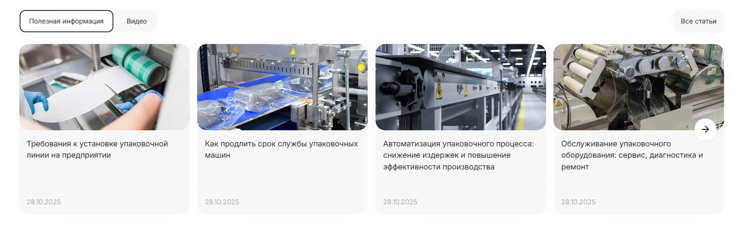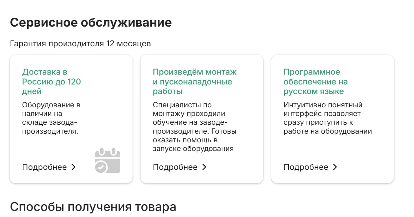 Раздел с запчастями пока отложен, но страницы с готовыми производственными линиями и услугами уже находятся в разработке — они помогут пользователям быстрее собирать решения «под ключ» прямо на сайте.