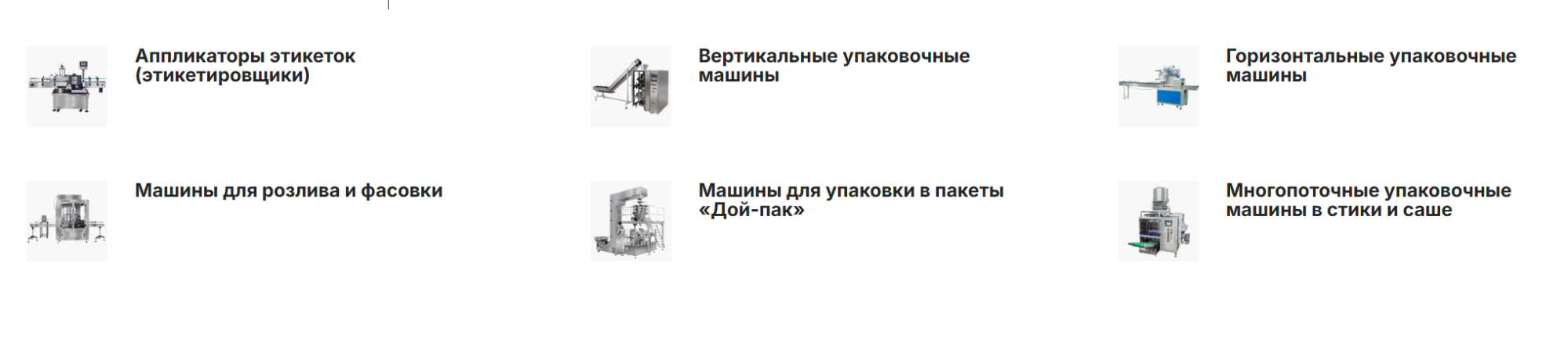 - первые шесть категорий каталога, от аппликаторов до дой-пак машин